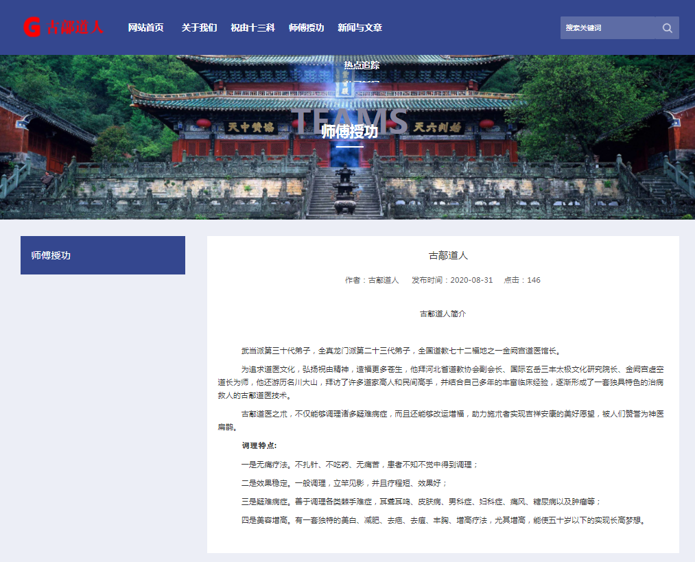 据古鄗道人祝由术培训中心官网介绍,古鄗道人是武当派第三十代弟子,全真龙门派第二十三代弟子,全国道教七十二福地之一金阙宫道医馆长。其调理特点是不扎针、不吃药、无痛苦,患者不知不觉中得到调理,更为神奇的是,还有一套独特的美白、减肥、去疤、去痘、丰胸、增高疗法,尤其增高,能使五十岁以下的实现长高梦想。