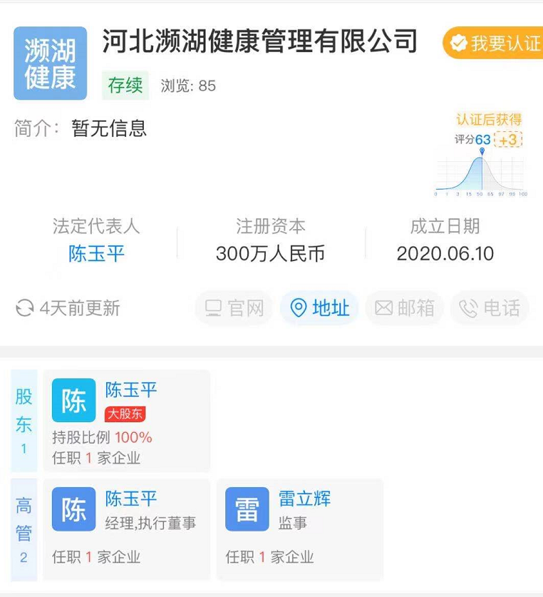 据天眼查显示,河北濒湖健康管理有限公司成立于2020年6月,法人代表陈玉平,其注册地址在河北省石家庄市无极县,经营范围为健康咨询;健康管理咨询(医疗、诊疗除外);会议服务;企业形象策划;市场营销策划;设计、制作、代理发布国内广告业务;一类医疗器械、日用品、化妆品零售。
