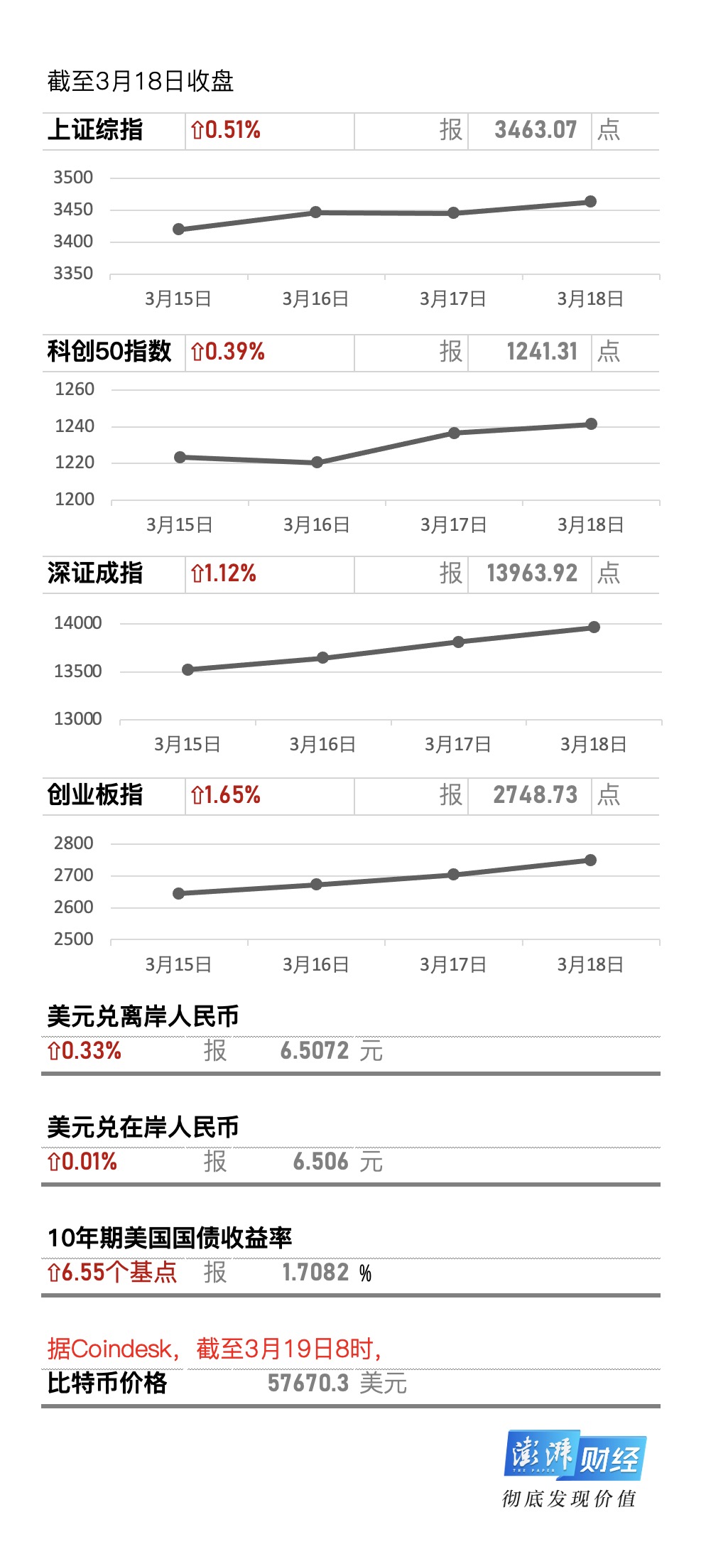 外汇方面,美元兑离岸人民币尾盘涨0.33%,报6.5072元;美元兑在岸人民币夜盘上涨0.01%,报6.5060元;美国债市方面,10年期国债收益率上涨6.55个基点,报1.7082%,盘中创下近13个月新高。比特币方面,根据比特币新闻资讯网Coindesk,截至3月19日8时,比特币价格57670.3美元。