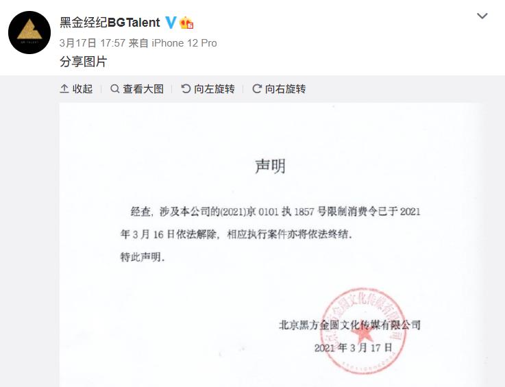 限制消费令在3月16日解除3月12日事件爆出之后,微博@黑金经纪BGTalent发布声明,将此纠纷指向了“前任管理层”。声明写道,“改文件所属执行案件指向的合同纠纷,发生于北京黑金前任管理层经营管理公司期间。现任管理层机关公司后,一直通过法律途径寻求相关争议的依法解决。”而据多方信息显示,此“前任管理层”或许就是黑金经纪前任法人聂涛(即聂心远)。