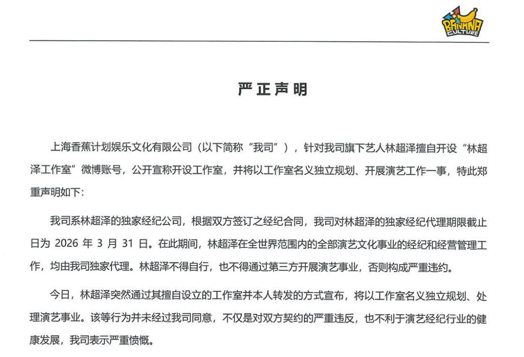 香蕉娱乐对林超泽成立新工作室一事发布的声明到了今年,行业更是遭受了资本寒冬和疫情的双重影响。在此影响下,“娱乐公司、经纪公司差不多死了70%”。在今年年初接受自媒体娱理采访时,卡司星球创始人刘佳曾说。