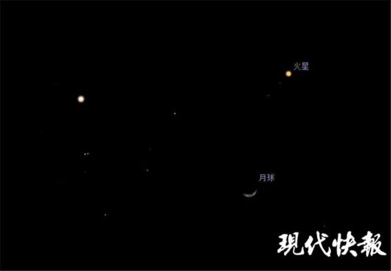 整个 3 月,火星位于金牛座天区内,亮度约 1 等。"3 月 20 日凌晨 2 点,火星将与月亮相合。" 中科院紫金山天文台工程师胡方浩介绍,19 日傍晚,一轮上弦月将与两颗红色的星星组成 " 红眼笑脸 " 的图案。