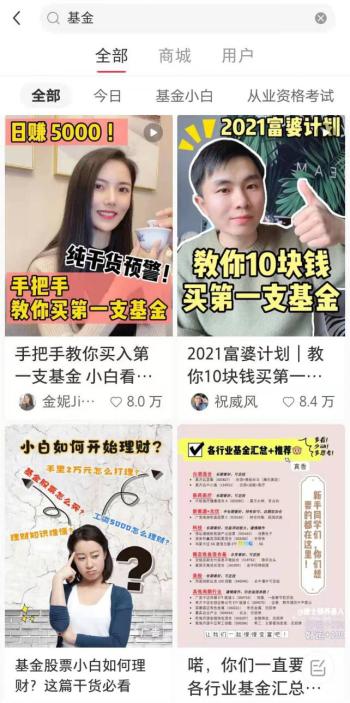 ▲记者在小红书搜索“基金”出现的页面对于更多年轻的新基民来说,玩基金的意义并不止于赚钱,他们期待着理财知识的丰富与经验的增长。