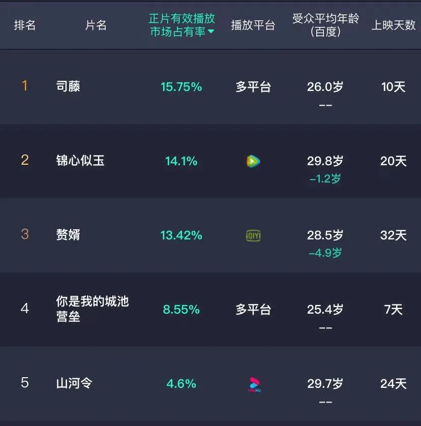 原以为三月会以耽改剧霸屏而收尾,却未料到“半路杀出”了bg题材的《司藤》和《你是我的城池营垒》(下文称《城池营垒》)。据云合数据显示,《司藤》的正片有效播放市场占有率已经跃居榜首,《城池营垒》也位列《山河令》之前。