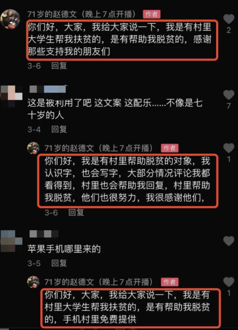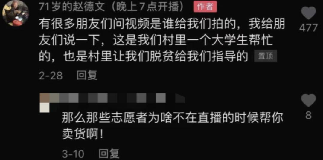 而账号所说的,老人的直播是村里的大学生帮忙扶贫的说法,也有点立不住。