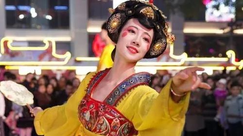 大唐不夜城,一个90后女孩扮成唐朝仕女,站在“不倒翁”上翩翩起舞,身姿轻盈,眼神妩媚。