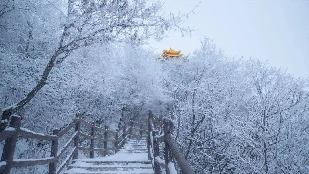 漫山的雪白围绕,道观内还有悠扬的诵经声,雪落枝头,峰林仙境,雾凇云海,一步一景一幅画,惊艳了整个冬天。