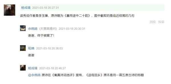 另一豆瓣网友杨成堉考证,指出该诗“作者是李玉臻,原诗题为《暴雨途中二十韵》,图中截取的是临近结尾的几句”,“原诗在《寓真诗词选评》里有,《送母回乡》原本是另一首五言古诗的标题。”