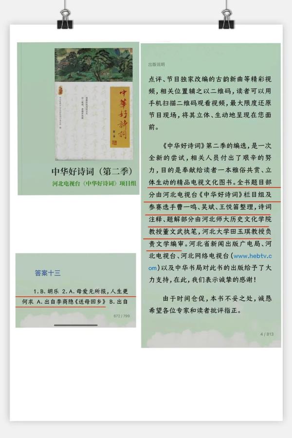 在由河北电视台品牌节目《中华好诗词》相关图书《中华好诗词(第二季)》,也将其作为“模拟自测题”的题目编入其中。该书“诗词注释、题解部分由河北师大历史文化学院教授董文武执笔,河北大学田玉琪教授负责文学编审”。
