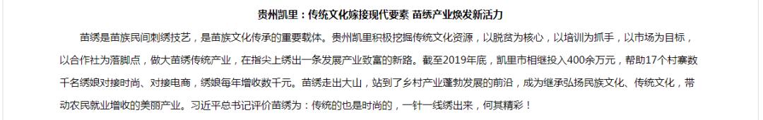 苗绣是苗族民间刺绣技艺,是苗族文化传承的重要载体。贵州凯里积极挖掘传统文化资源,以脱贫为核心,以培训为抓手,以市场为目标,以合作社为落脚点,做大苗绣传统产业,在指尖上绣出一条发展产业致富的新路。截至2019年底,凯里市相继投入400余万元,帮助17个村寨数千名绣娘对接时尚、对接电商,绣娘每年增收数千元。苗绣走出大山,站到了乡村产业蓬勃发展的前沿,成为继承弘扬民族文化、传统文化,带动农民就业增收的美丽产业。习近平总书记评价苗绣为:传统的也是时尚的,一针一线绣出来,何其精彩!