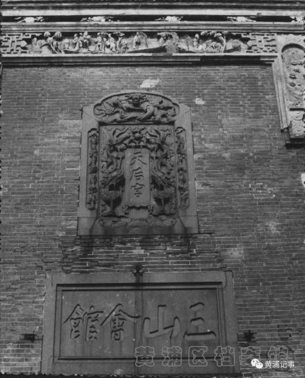 20世纪20年代三山会馆同人合影(三山会馆管理处提供)会馆大门呈月洞形,门上有浮雕石刻。门后有戏台和天井,戏台上有螺旋形藻井,下部饰以上海城楼图形,镂刻、镶嵌工艺精美。戏台后大殿5楹,正殿金碧辉煌,柱子为粗大花岗石与杉木拼接,庄重别致,殿内供奉天后神像。西侧为花园,池石亭台,参差掩映,绕以西式砖墙。