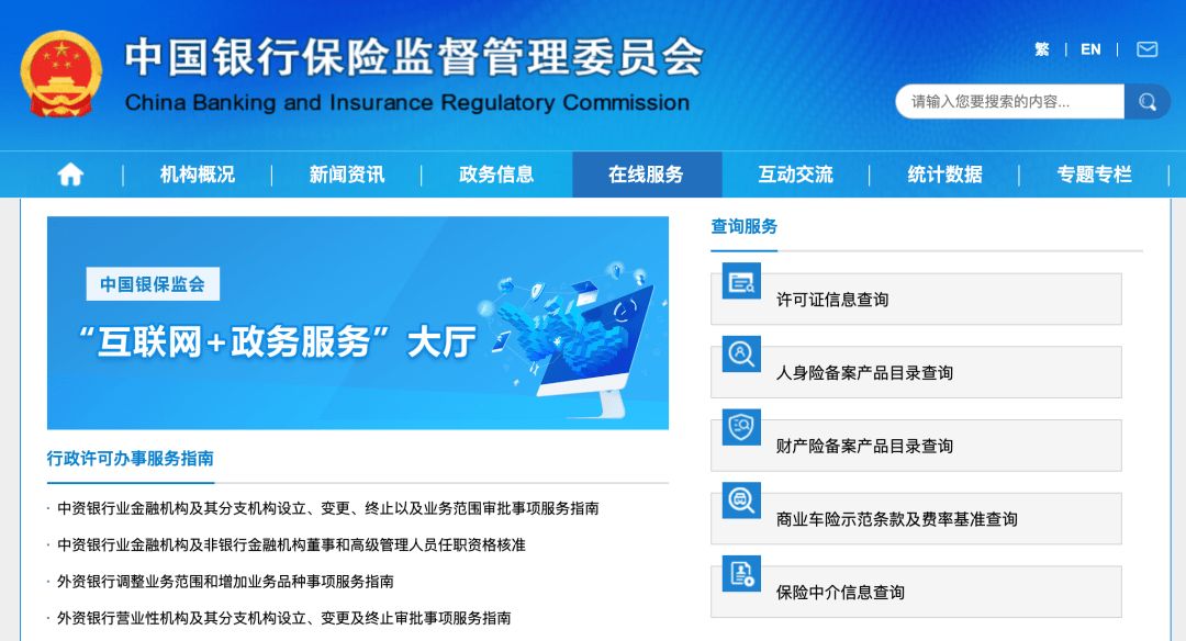 打开“中国银行保险监督管理委员会”官方网站(http://www.cbirc.gov.cn/cn/view/pages/index/index.html),在“在线服务”中可以查询各种资质信息。