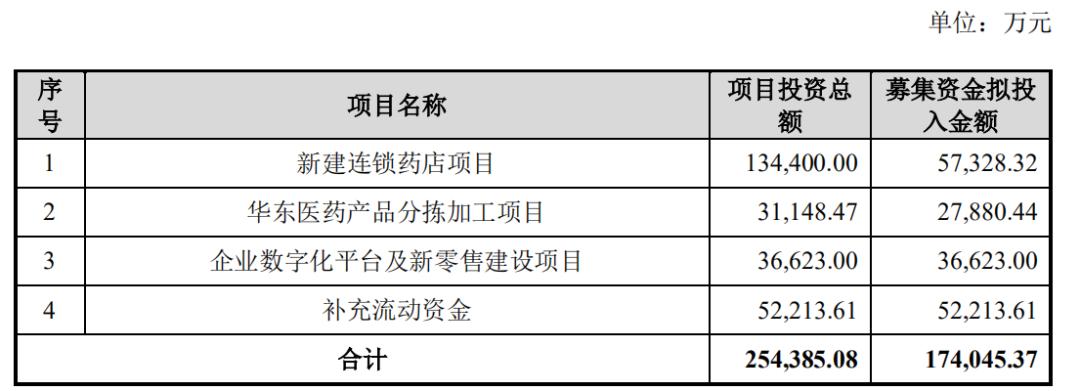 所募集资金将用于4个项目,包括用于新建连锁药店项目5.73亿元、用于华东医药产品分拣加工项目2.79亿元、用于企业数字化平台及新零售建设项目3.66亿元、用于补充流动资金5.22亿元。