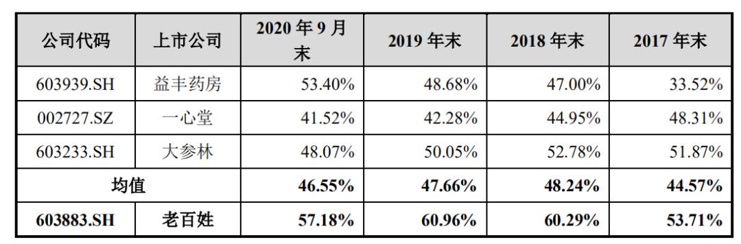 老百姓药房负债率情况,来源:公告截至2020年9月末,同行业一心堂负债率41.52%、大参林负债率48.07%、益丰药房负债率53.40%,而老百姓药房负债率达57.18%,位列行业第一。