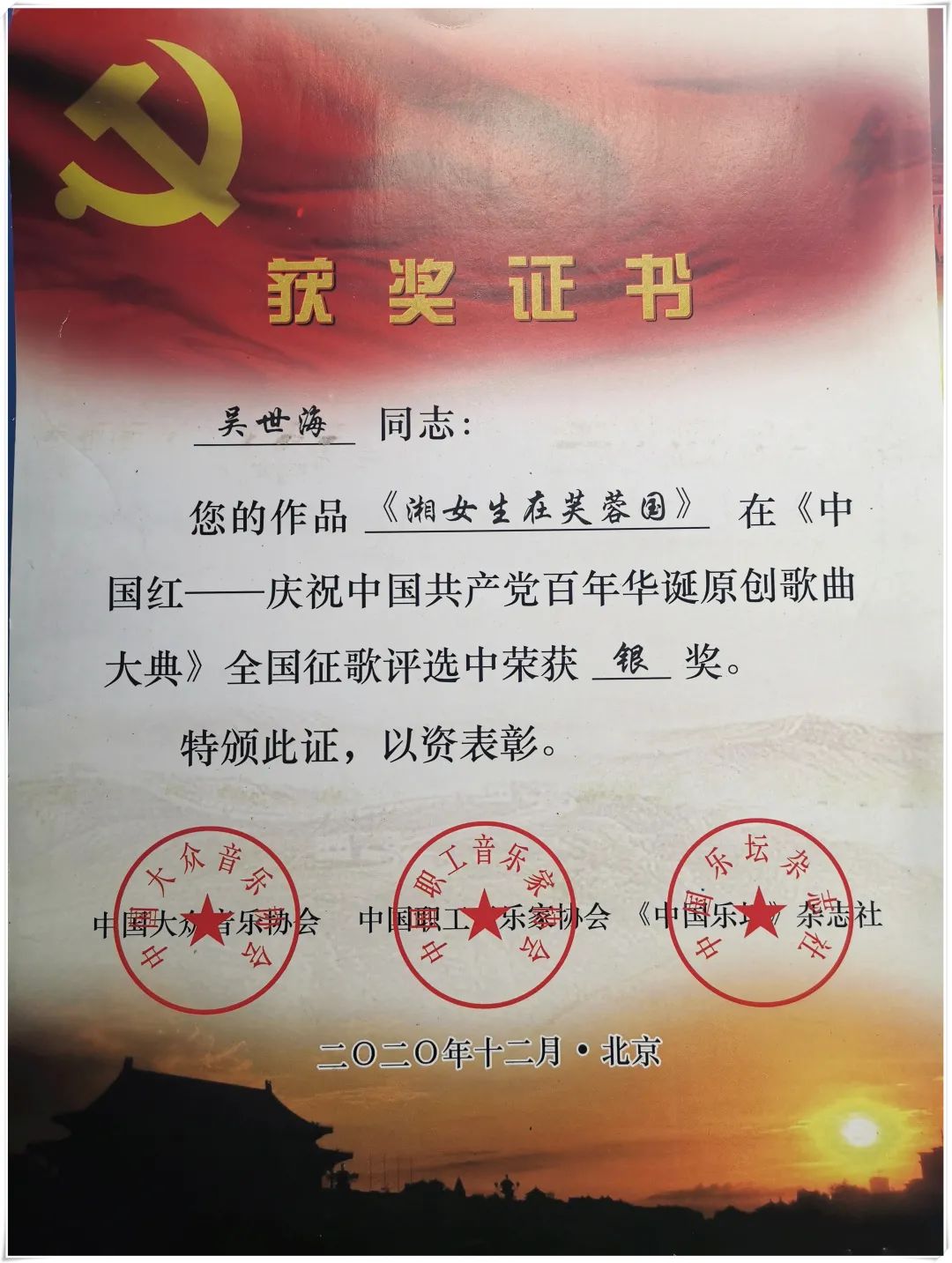 吴世海的获奖证书歌曲创作是一个有技术含量的事情。“要考虑歌曲的主题,词句要推敲琢磨,曲调要昂扬积极。”聊起歌曲创作,吴世海立即变得兴致高昂。