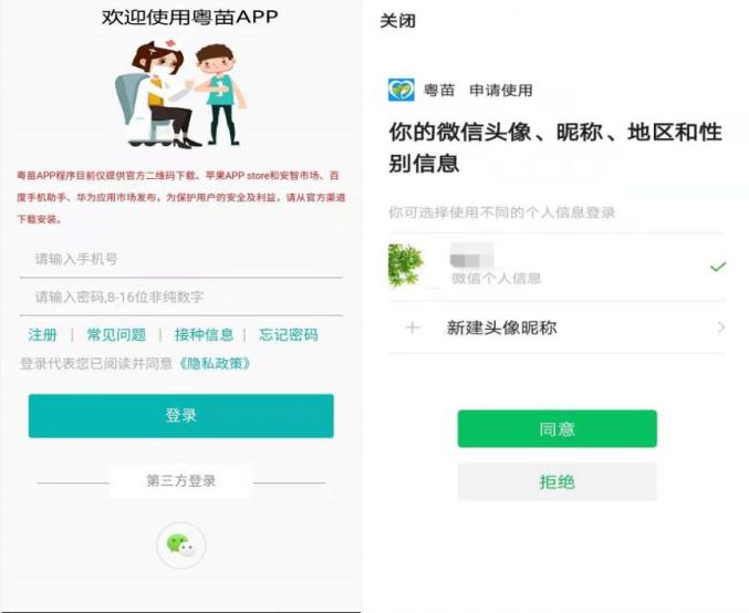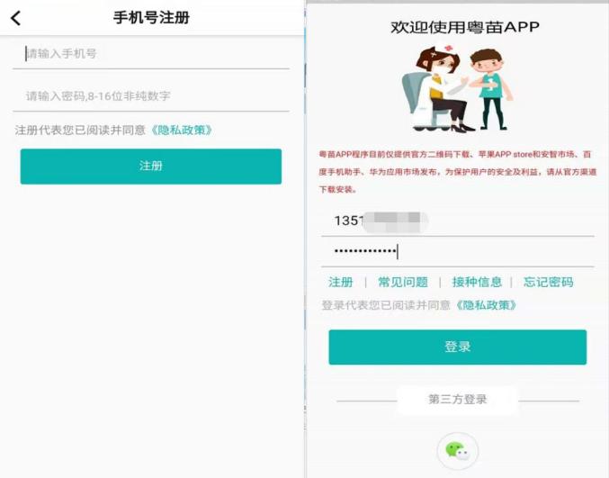 打开粤苗APP,可以通过绑定微信的方式直接登录;也可以注册账号,注册完成后,用注册的账号密码登录即可,操作流程如下图所示:绑定微信登录: