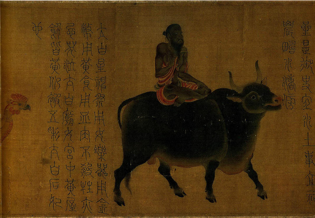 除了乘坐牛车,人们也采用直接骑牛的方式,骑牛者一般为牧童,或是高人、闲散之人,以明代张路的《老子骑牛》图为代表。春秋末年,天下大乱,老子欲弃官归隐,遂骑青牛西行。至灵宝函谷关时,受关令尹喜之请著《道德经》。老子为“东方圣人”,东方为青色。后世遂以水牛为“青牛”。