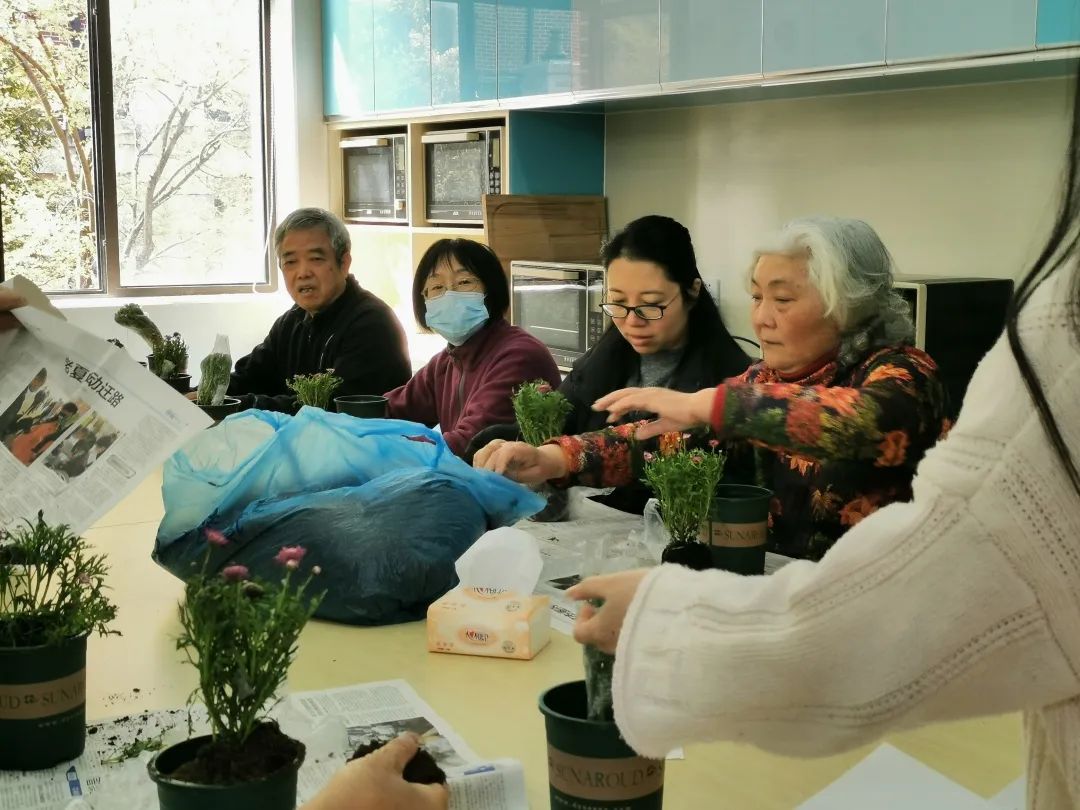 课堂上,工作人员为大家准备了盆栽种植材料包和半开花苞的姬小菊。居民们根据指导,倒入营养土,把花种上,再盖上一层营养土。期间,大家还不时地提出问题,寻求解答。“新手的常见错误,基本上是浇水、施肥、光照、温度、通风等环境调控方面处理不当。”胡伟康先为大家普及种植的知识,然后提醒大家,“在种植过程中,需要掌握五字诀:光、温、水、肥、气。”尤其是光照的强度和时间的长短,没有光的存在,光合作用就不能进行,花卉的生长发育就会受到影响。