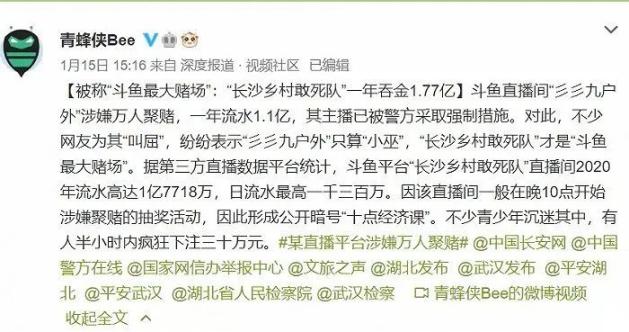 1月15日,斗鱼主播“长沙乡村敢死队”被爆出长期利用斗鱼直播平台的抽奖机制,变相进行涉嫌赌博的活动。其专门用于涉赌行为的小号在开播9天内流水已经高达1383.5万元。这种“涉嫌赌博”的实际玩法是直播间观众购买指定道具打赏主播后,就可以参与彩票式的虚拟货币(鱼翅)抽奖,抽中虚拟货币奖励又可以通过第三方兑换成现金,单笔最高可以赚5万,巨大的吸引力引得许多人变成赌徒参与其中,甚至有用户半小时在“长沙乡村敢死队”的直播间下注30多万人民币。