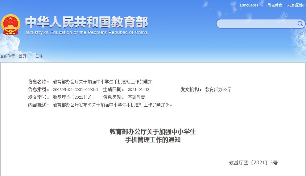 在2月1日,教育部办公厅就印发了《关于加强中小学生手机管理工作的通知》,针对中小学生上学是否可以携带手机、老师是否可以使用手机布置作业等问题进一步作出了明确规定。
