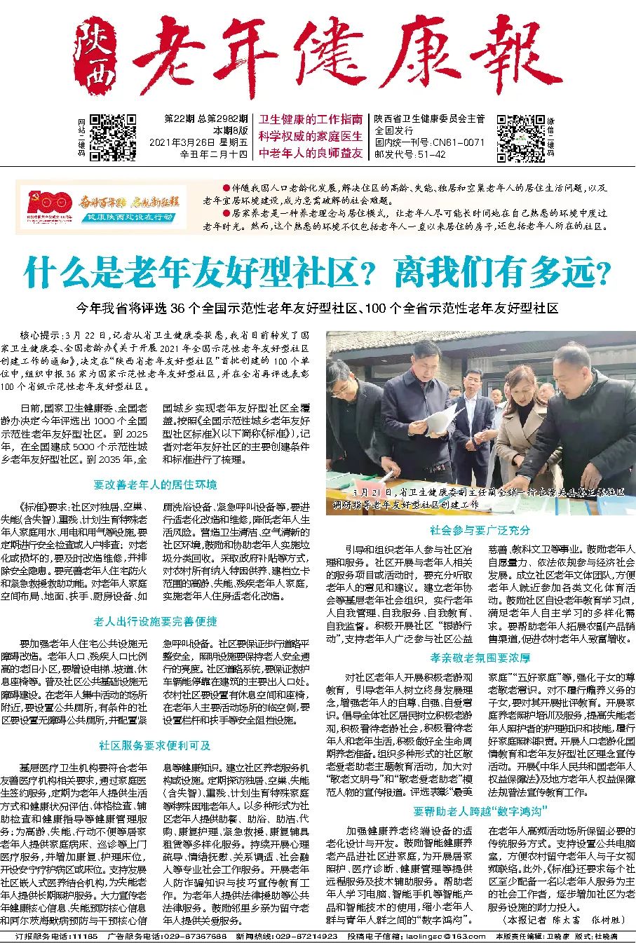 核心提示:3月22日,记者从省卫生健康委获悉,我省目前转发了国家卫生健康委、全国老龄办《关于开展2021年全国示范性老年友好型社区创建工作的通知》,决定在首批创建的100个“陕西省老年友好型社区”中,组织申报36家为国家示范性老年友好型社区,并在全省再评选表彰100个省级示范性老年友好型社区。