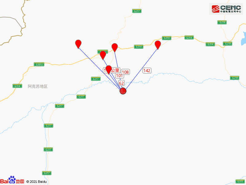 周边县城:震中距沙雅县62公里、距新和县101公里、距库车市108公里、距轮台县142公里、距拜城县161公里,距阿拉尔市166公里,距乌鲁木齐市495公里。