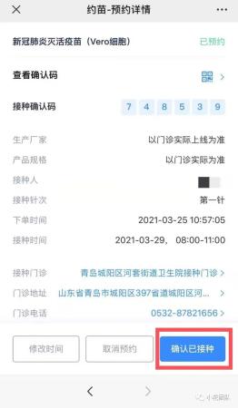 预约成功,点击查看订单即可查看预约详情,如果信息填写错误或者其他原因想要更改或取消预约,可以在预约详情界面上选择“修改时间”或“取消预约”,接种完成后点击“确认已接种”。