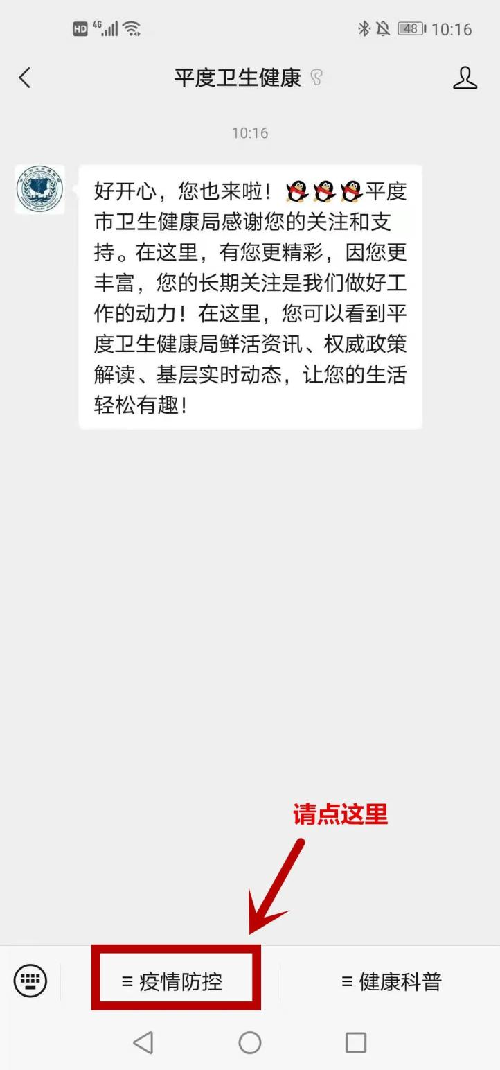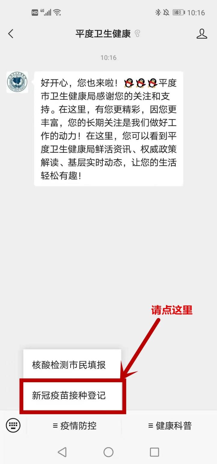 方式二:关注“平度卫生健康”公众号,点击左下角“疫情防控”——“新冠疫苗接种登记”。