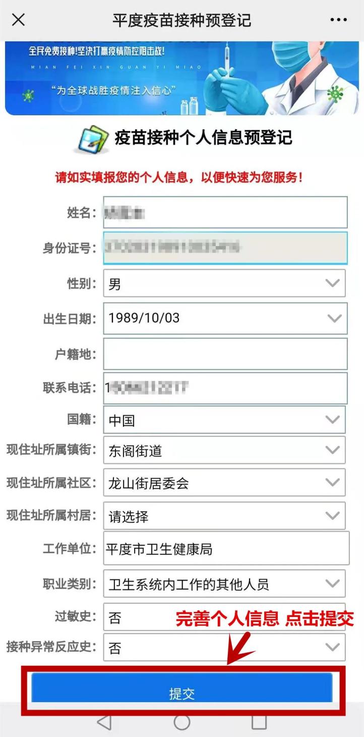 进入“平度疫苗接种预登记”界面如实填写个人信息,完成登记。