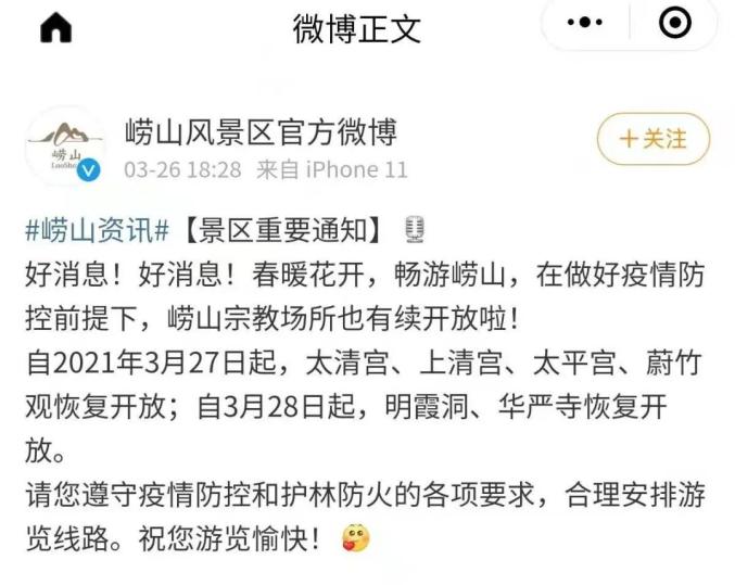 定了!崂山景区这些场所恢复开放!更好玩的还有……