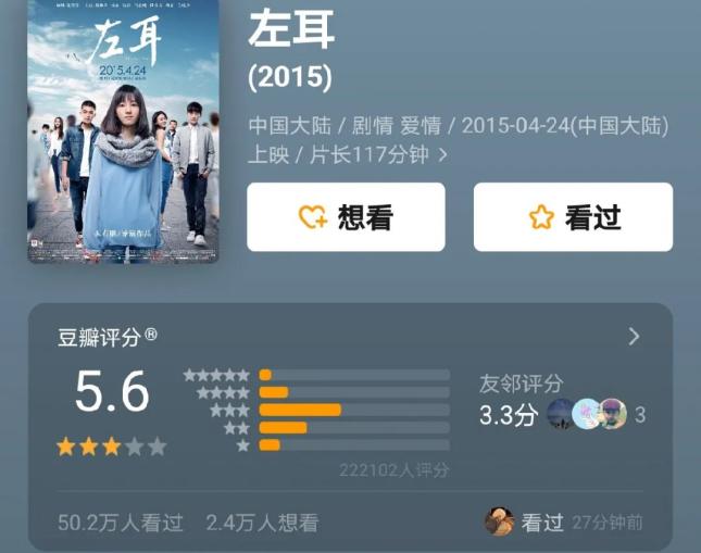 青春疼痛文学改编的《左耳》,评分未达及格线:
