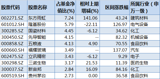 2020年末,前十大重仓股分别为:东方雨虹(002271.SZ)、隆基股份(601012.SH)、国瓷材料(300285.SZ)、先导智能(300450.SZ)、五粮液(000858.SZ)、福耀玻璃(600660.SH)、立讯精密(002475.SZ)、三诺生物(300298.SZ)、新宙邦(300037.SZ)、贵州茅台(600519.SH)。