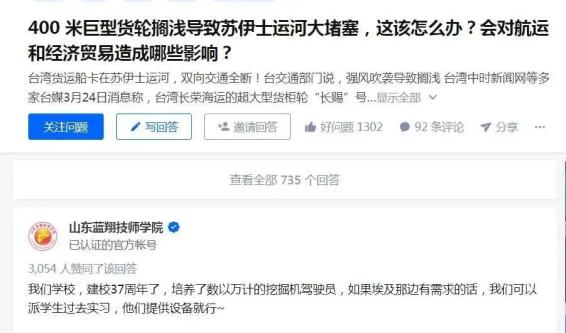 3月25日,知乎认证用户“山东蓝翔技师学院”发布回答,“我们学校,建校37周年了,培养了数以万计的挖掘机驾驶员,如果埃及那边有需求的话,我们可以派学生过去实习,他们提供设备就行~”这则回答也引发了网友们的热情,面对评论中各种“玩梗”式的提问调侃,“山东蓝翔技师学院”也一一给出机智回应。