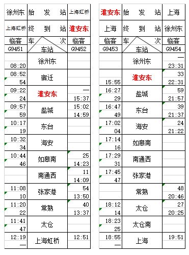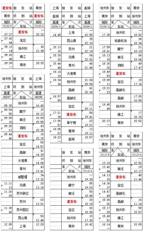 同时,新增的徐州东~上海G8297/G8298次1对、上海~盐城G8294/5 G8296/3次1对、徐州东~南京C3109/12 C3119/8次1对、南京~徐州东C3115/4 C3113/6次1对等,均在淮安东停靠。