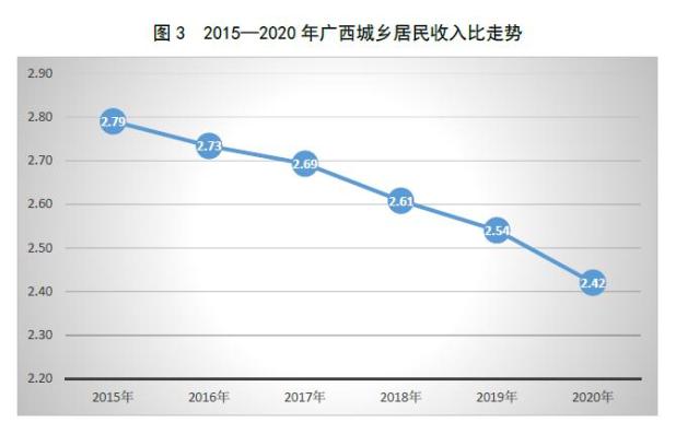 (三)城乡差距缩小“十三五”期间,城镇居民收入年均增速6.3%,2016年—2020年分别为7.2%、7.7%、6.3%、7.1%、3.2%;农村居民收入年均增速9.4%,2016年—2020年分别为9.4%、9.3%、9.8%、10.0%、8.3%。从收入增速看,各年城镇居民可支配收入增速均持续低于农村,年均增速低于农村3.1个百分点。从城乡居民收入比看,2020年城镇居民与农村居民可支配收入比为2.42:1,较2015年的2.79:1缩小了0.37,“十三五”期间城乡收入差距呈逐年缩小态势。
