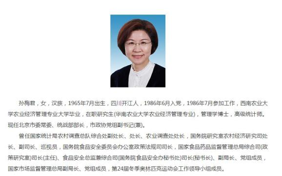 北京市委常委、统战部部长孙梅君:2020年12月履新,此前是国家市场监督管理总局副局长