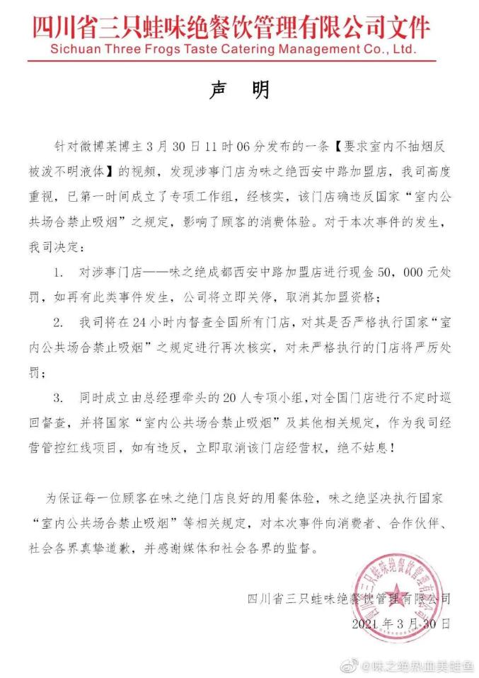 30日下午6点过,涉事门店上级公司——四川省三只蛙味绝餐饮管理有限公司通过官微发布声明,对该门店——味之绝成都西安中路加盟店进行5万元现金处罚,如再发生类似事件立即关停,并取消其加盟资格。