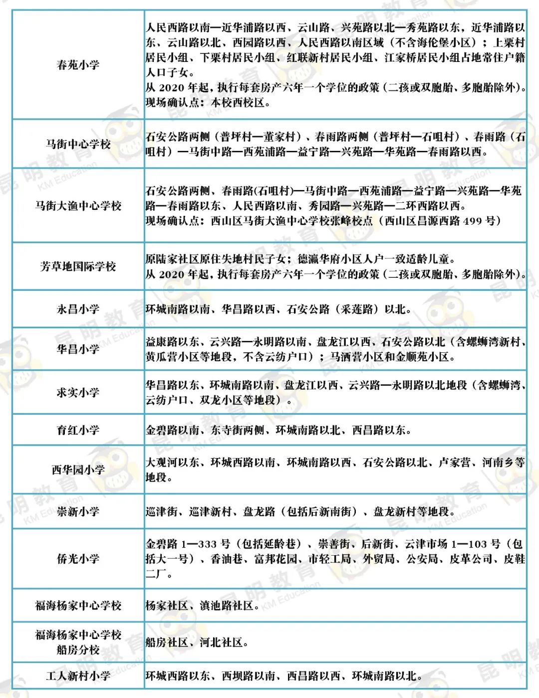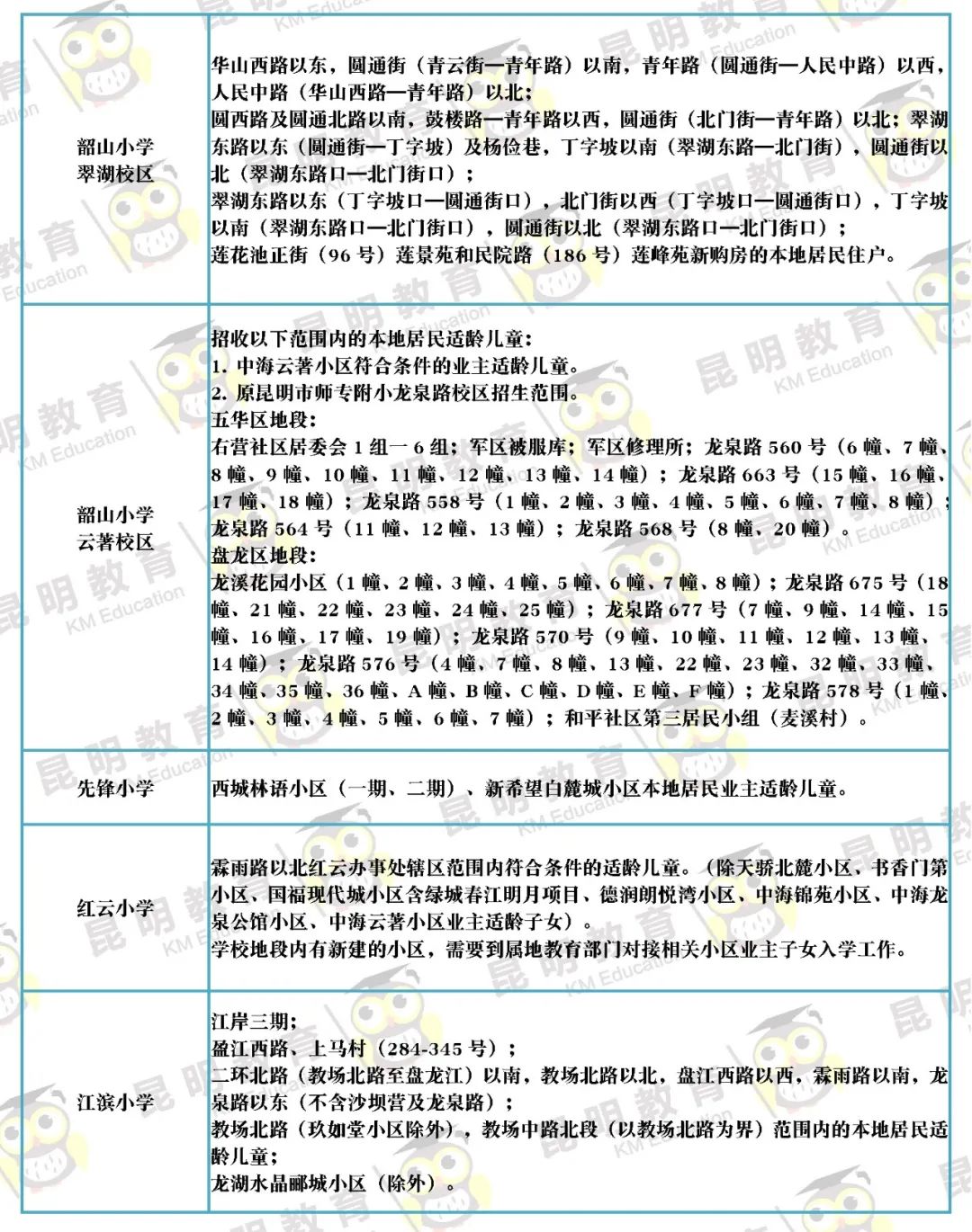 教育君实地走访五华区、盘龙区、官渡区、西山区、呈贡区、经开区、晋宁区多所学校,加上热心家长的帮忙,相继搜罗了216所公办小学招生范围信息。