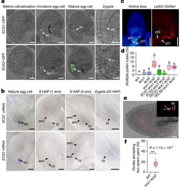 卵细胞分泌的天冬氨酸蛋白酶阻止多精入卵研究发现在受精前,ECS1和ECS2主要分布在卵细胞内,而当精细胞与卵细胞融合后,ECS1和ECS2则迅速分泌在卵细胞周围,降解其附属细胞(助细胞)分泌的花粉管吸引信号Lure,从而阻止输送更多精子的花粉管进入胚囊,避免受精卵再度与精子融合。