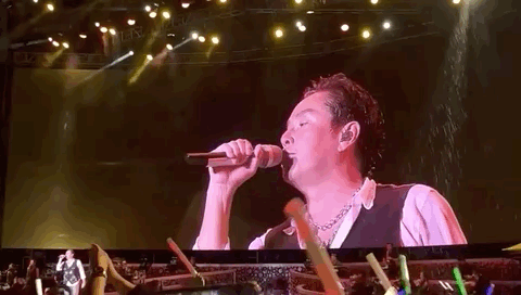 近三个小时的演唱会,他只喝了一口水,在唱到《讲不出再见》时,被雨水淋透的谭咏麟有几句没有唱好,到了副歌部分,高音部分有些哽咽。