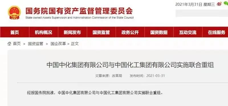 中央企业战略性重组和专业化整合再下一城!国务院国资委网站3月31日发布消息,经报国务院批准,中国中化集团有限公司(中化集团)与中国化工集团有限公司(中国化工)实施联合重组。在两家世界500强的央企重组之后,将形成一家资产过万亿、员工数达到20万的巨无霸公司。