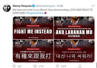 近期,亚裔在一些西方国家频频遭遇种族歧视和暴力,许多知名亚裔人士已经发声,要求改变现状。今天,菲律宾拳王曼尼·帕奎奥也在推特上发文:“我们的血液只有一种颜色!停止歧视!爱与和平送给每个人。”在推文下面,他发了四张自己的头像,分别用英文、菲律宾文、中文和韩文配文道:“有种来跟我打”。