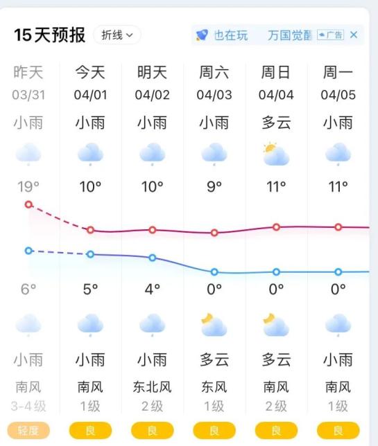 根据市气象局预报, 4月2日夜间至4月3日白天:小雨,气温0到10度。4月3日夜间至4月4日白天:小雨转多云,气温0到11度。4月4日夜间至4月5日白天:多云转小雨 ,气温0到11度。(请大家密切关注最新天气预报,及时合理安排行程)。