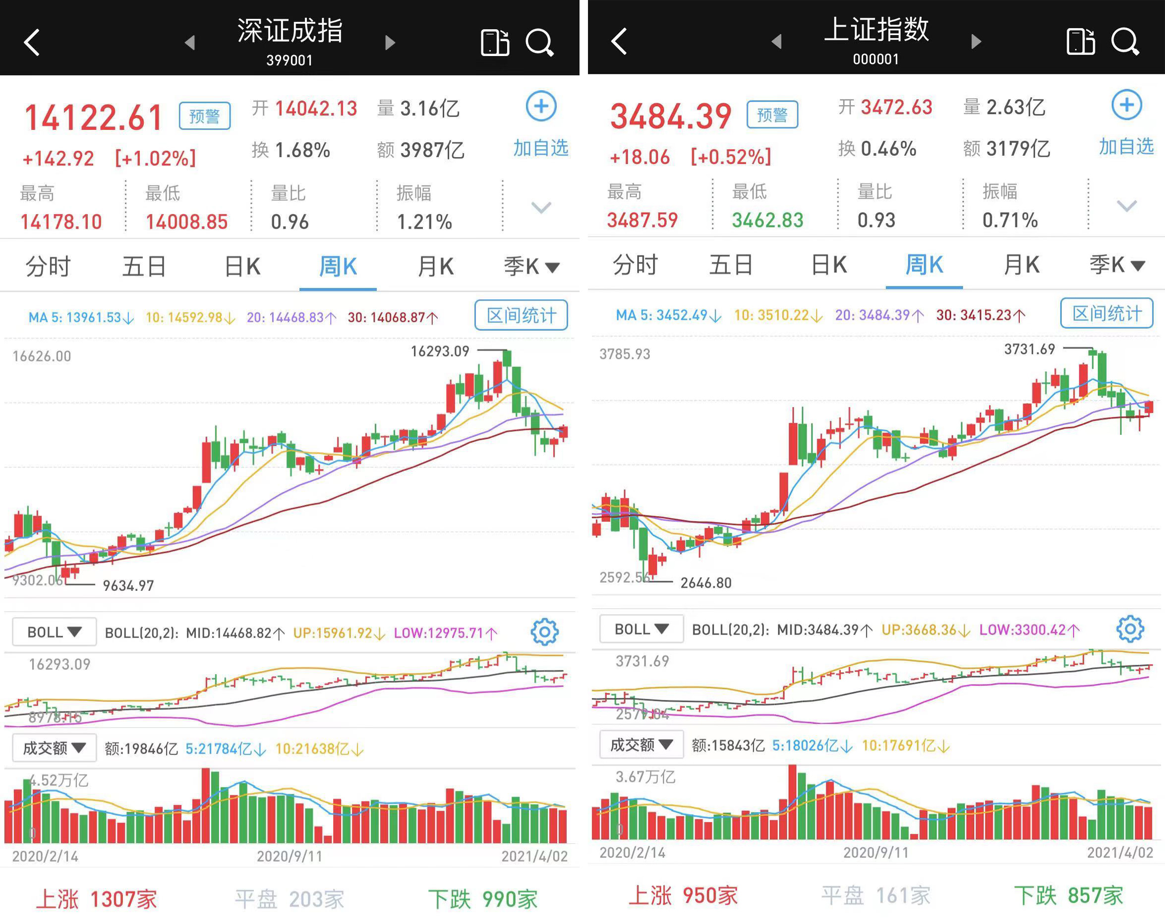 至4月2日收盘,上证综指涨0.52%,报3484.39点;科创50指数涨2.62%,报1299.92点;深证成指涨1.02%,报14122.61点;创业板指涨1.31%,报2852.23点。