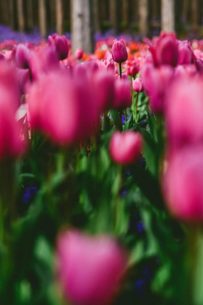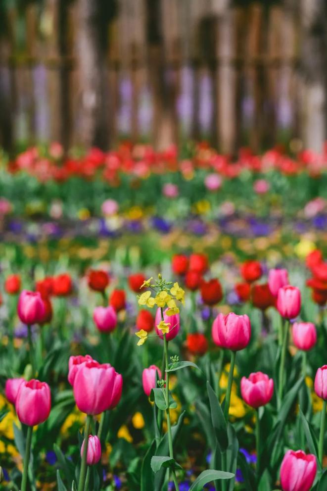 【芳香风貌区】从花博南园1号门进入,首先映入眼帘的就是芳香风貌区,该区域由水杉东西路、花溪叠水景观等部分组成。道路两旁种植成片的郁金香,底下点缀以角堇,形成了一片花的海洋。