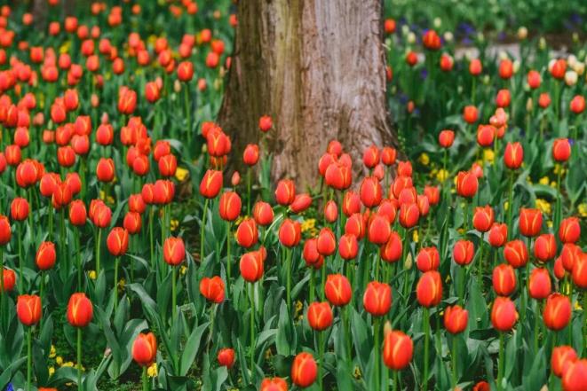 风貌区依托水杉林作为基底进行整体花卉的亮点打造,入口处的正前方设置了花溪叠水景观小品,台阶高低错落,流水清脆悦耳,与两侧浮岛般的片片郁金香花海相映成趣。花卉以条带状、斑块状布置,林下提供了供游客停留的空间,是拍照打卡的好去处。