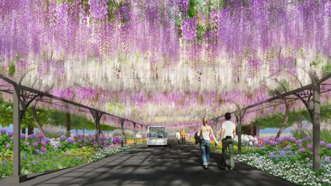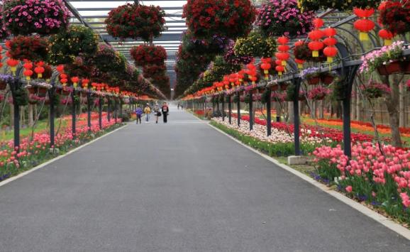 ▲效果图目前,由于紫藤花期未到,紫色花境尚未呈现,园方在长廊上布置了大片花球垂钓而下,搭配两旁的郁金香、二月兰花海,同样美不胜收。