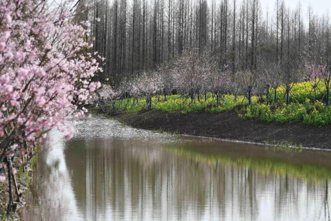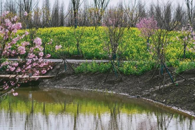 【百樱林】在紫藤长廊西南面,以“百亩樱花、百种樱花、水路赏樱”为亮点,打造了一片百樱林,采用片植、列植、丛植、点植的种植方式,共栽植樱花1500余棵,为游客提供樱花道、樱花水岸、樱花坡等多种不同主题游览方式。樱花林下的百亩油菜花海也已盛开,粉色、黄色交相辉映。