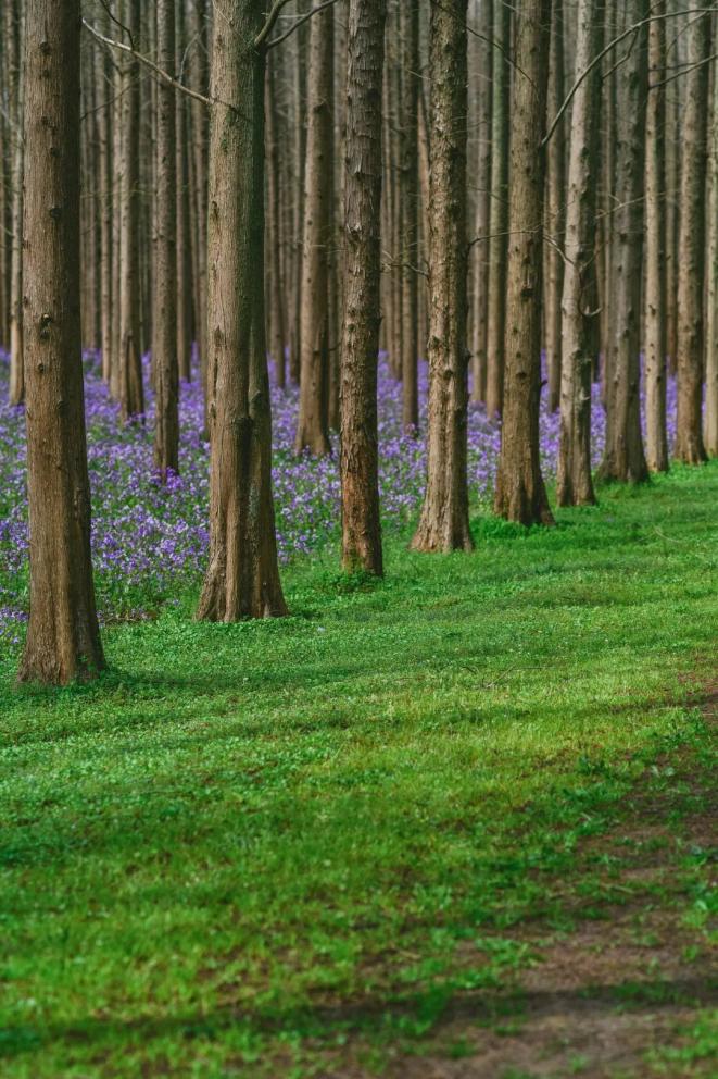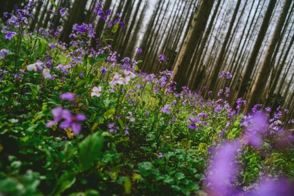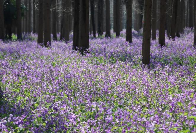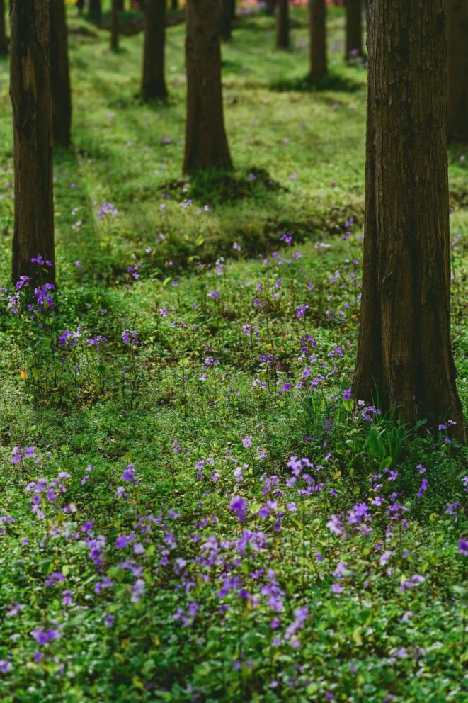 桂花路两旁的二月兰正值花期,遥遥望去,如同一片紫色的海洋。二月兰花朵鲜艳,不管晴天、雨天,在林间都亮眼异常,自带神秘感的紫色花瓣在绿叶的衬托下更显高贵。