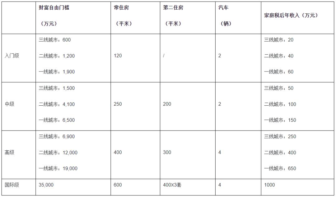〓 比如在三线城市,入门级财富自由是600万资产,主要包括一套120平米的市区常住房、2辆车、20万元的家庭税后年收入和250万元的金融投资。